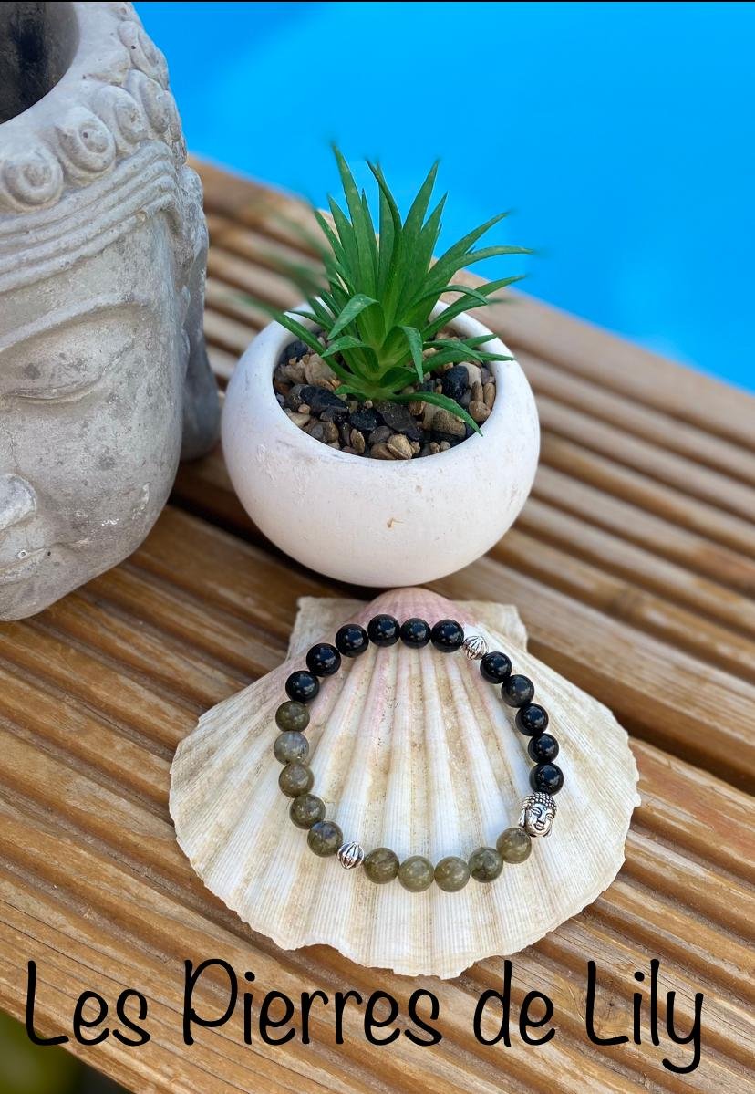 Une alliance protectrice et profondément ancrante. L’obsidienne agit comme un bouclier puissant, favorisant la clarté et la stabilité intérieure, tandis que la labradorite absorbe les énergies indésirables et soutient l’intuition. Un bracelet idéal pour préserver son énergie et avancer avec assurance et équilibre au quotidien.