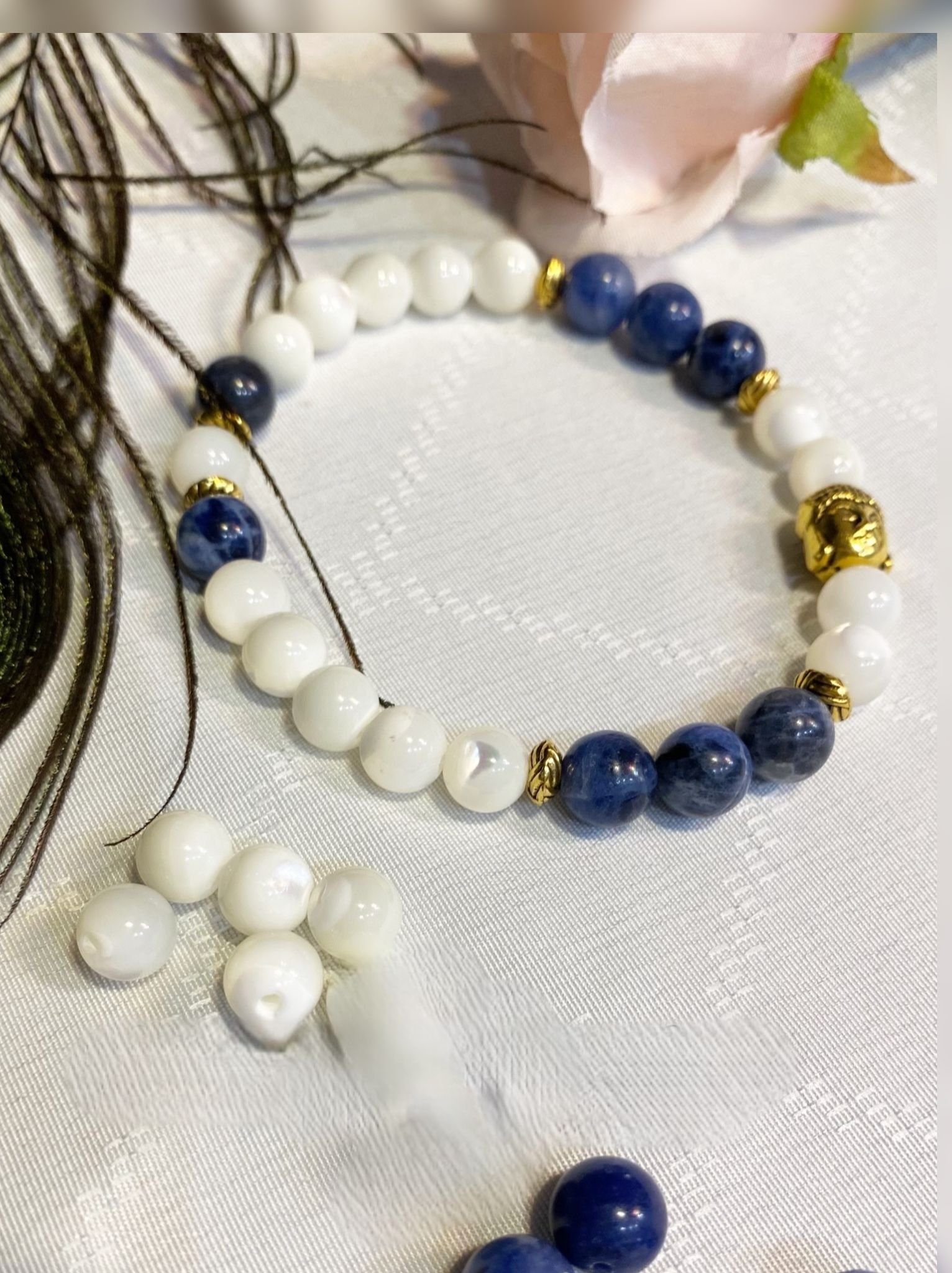Une alliance élégante entre clarté et douceur. La sodalite favorise la lucidité, la communication et l’équilibre émotionnel, tandis que la nacre apporte apaisement, sensibilité et harmonie. Un bracelet délicat qui soutient le calme intérieur et l’expression sereine au quotidien.